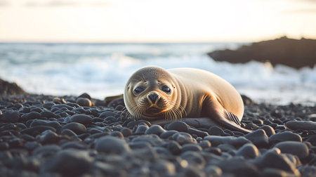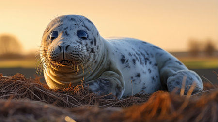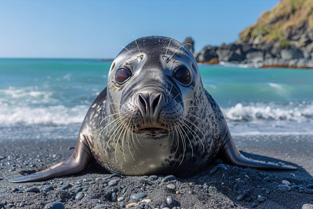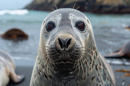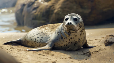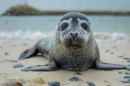 Digital artwork of gray seal sitting on the beach, looking at the camera, ocean in the background, award winning wildlife photography, rule of thirds composition technique, natural lighting.