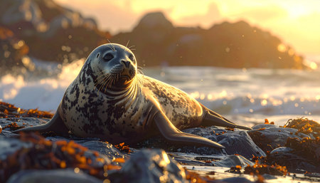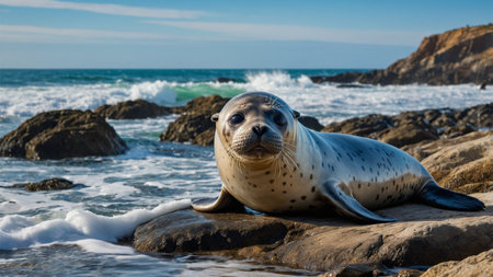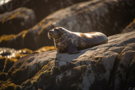 pacifical seal basking in the sun on a rocky shore, created with generative ai