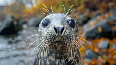 Adorable seal pup with long whiskers and large, dark eyes looks curiously at the camera, river and autumn leaves in the background.