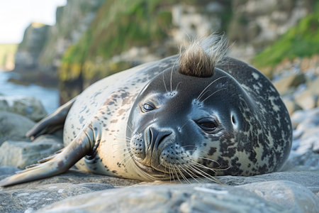 A cute seal with long hair on its head is lying down, surrounded by rocks in the british countryside. the natural light illuminates his face and captures him in closeup from an angle of view. he has gray fur with white spots. his eyes are closed as he resties peacefully. in the background there's gr