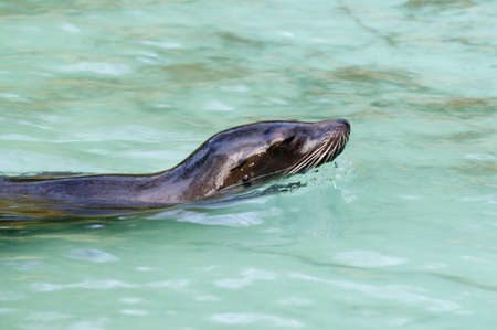a young brown for seal looks out of the water while swimming