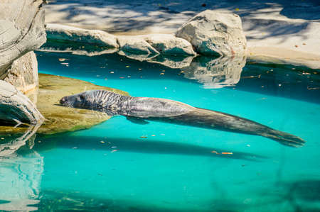 Captive gray seal bored in its aquarium as it supports the summer heat lying with its body in the water