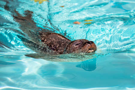 An hair seal is swimming. The animal is wet and nitidous.