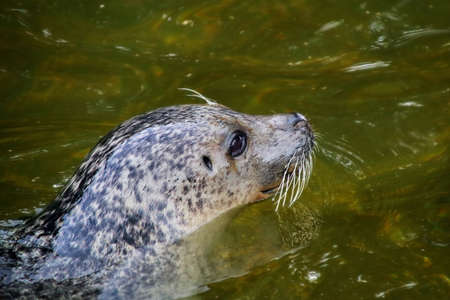 Close up of a seal in the water. The seal is looking for food.