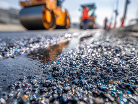 A shiny black surface of newly poured asphalt reflects sunlight, while heavy construction equipment operates softly in the background, capturing ongoing roadwork eff