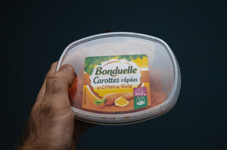 Marseille, France - Jul 30, 2020: POV of a male hand holding a pack of Bonduelle grated carrots with Sicilian lemon on a black-blue background