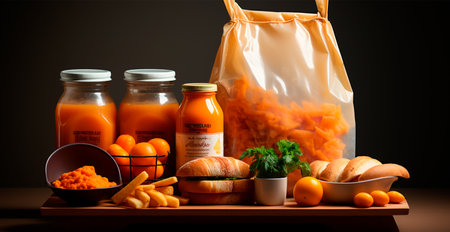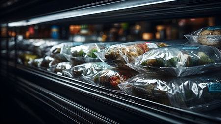 Food in plastic bags on a black background. The concept of plastic pollution.