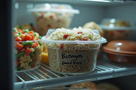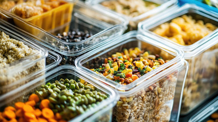 Plastic boxes with pre-packaged vegetable salads, put up for sale in a commercial refrigerator