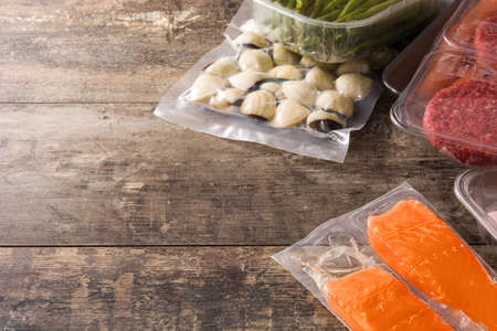different types of packaged food. Beef, vegetables and seafood on wooden table. Copy space