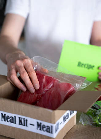 Man Unpack Online Home Food Delivery. Box with packed tuna, shrimp, vegetables and recipe card on a kitchen background. Food delivery services during coronavirus pandemic and social distancing