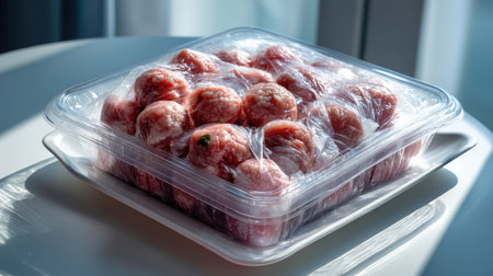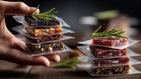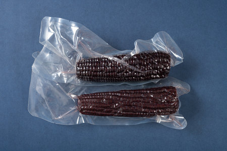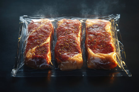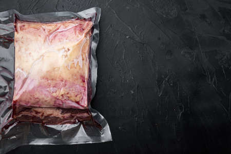 Vacuum packed meat, steak. Sous-vide, new technology cuisine. Selective focus, copy space