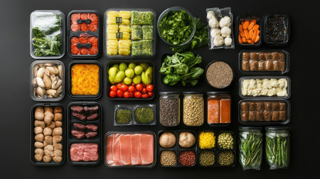 Weight loss diet balanced with fresh organic meal by delivery service of containers with healthy food, daily lunch box ready menu plan concept. Flat lay top view.