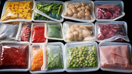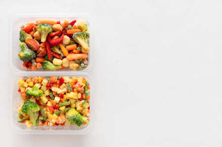 Frozen sliced vegetables salad in plastic containers on a white background. Copy space, top view, flat lay.