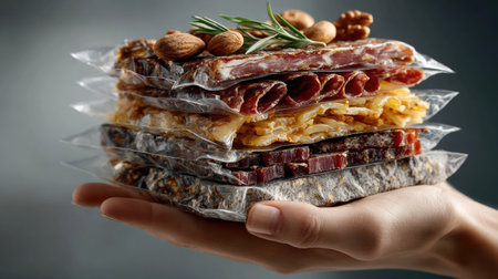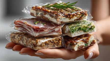 Female hand holding vacuum bags with different types of products on green background close-up.