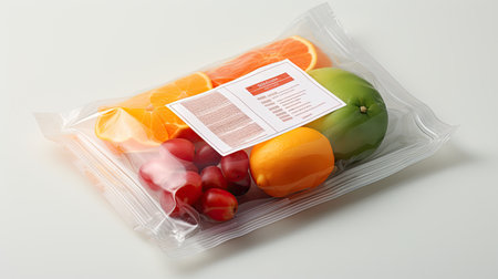 Tomatoes and Champignon Mushroom in food preservation plastic bag on white