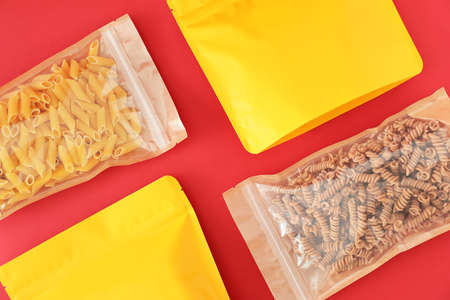 Cherry tomatoes and minced meat in vacuum bags close-up on pink background top view.