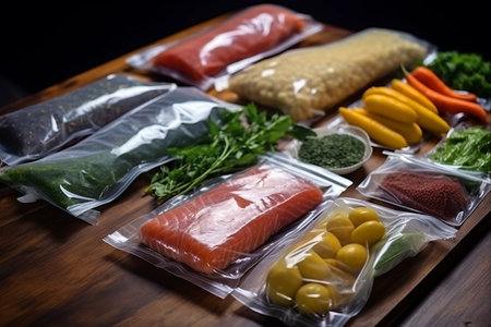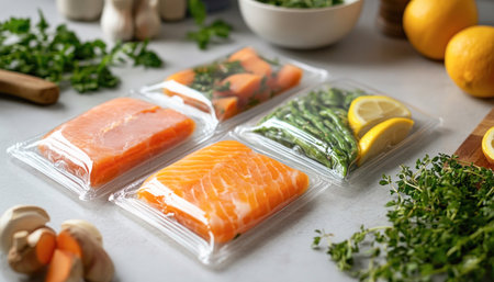 Fillet and vagatables in vacuum bags for sous vide coocing on white marbleized background, horizontal