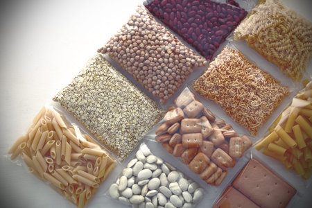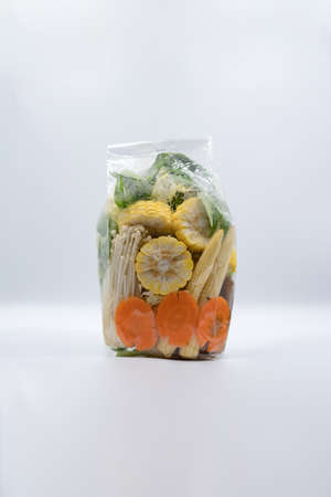 Carrots, vegetables, corn, and golden needle mushrooms are ready for sale in transparence plastic bags on white background.