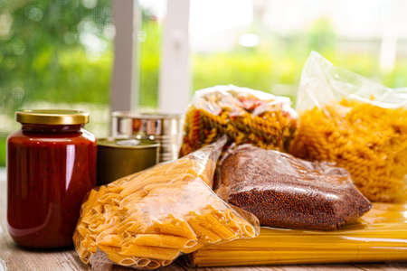 Home food supplies, necessary food for the period of quarantine and isolation, the concept of stay at home, canned food , various pasta and flour, sugar and cookies, top view