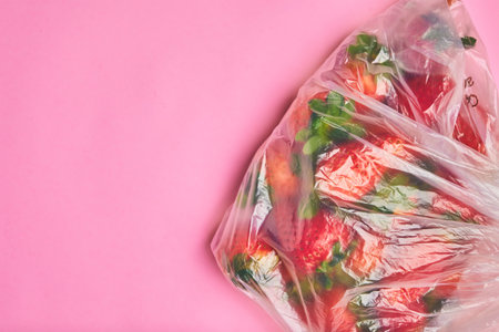 An overhead shot of fresh strawberries in a plastic bag on a pink background