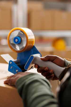 Warehouse employee putting adhesive tape on carton boxes, preparing customers orders in storage room. African american worker checking products before shipping packages. Close up shot