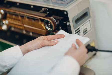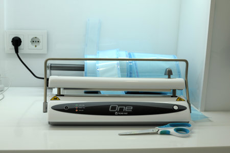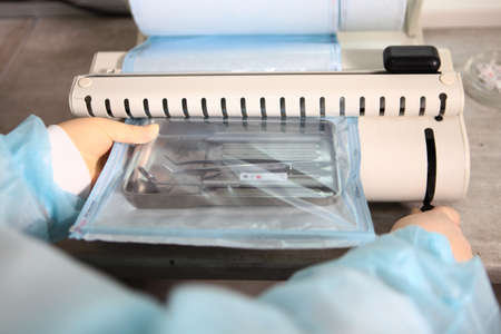 Dentist's assistant hands in gloves packing dental instrument set for autoclaving in a plastic bag using vacuum packing machine. Sterility and safety care concept