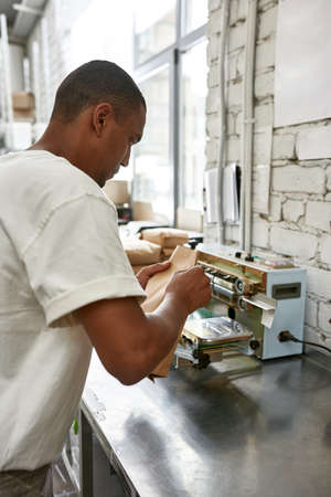 Black worker packing package with coffee beans