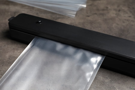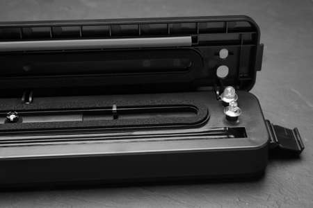 Sealer for vacuum packing with plastic bag on gray table, closeup