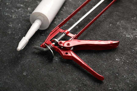 Glue gun and tube on black textured background, closeup