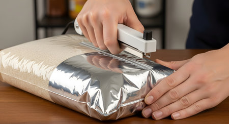 A person's hands use a white, portable heat sealer to seal the top of a large foil and plastic bag filled with rice. The action takes place on a wooden table, demonstrating a method for food preservation and keeping food fresh.
