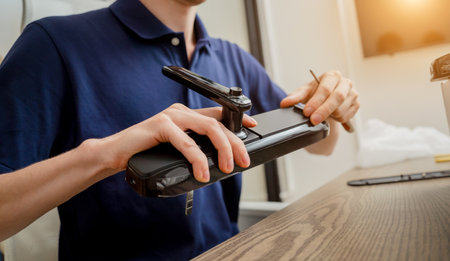 A technician assembles and installs smart electronic door lock for house protection