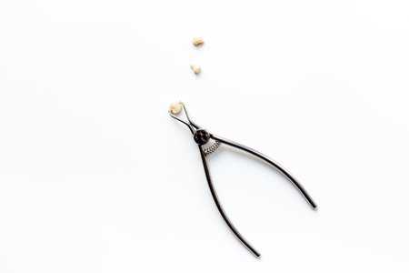 Teeth crows for implantation with dental tooth extraction forcesps on white background. Professional Dentist desktop, top view.