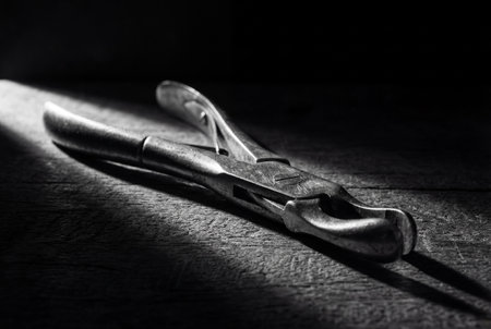 An antique pair of steel dental pliers lies on a dark wooden table illuminated by a shaft of light that emphasizes the textured metal and vintage craftsmanship.
