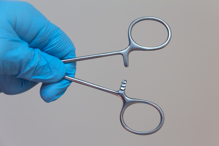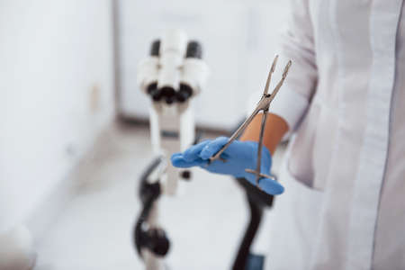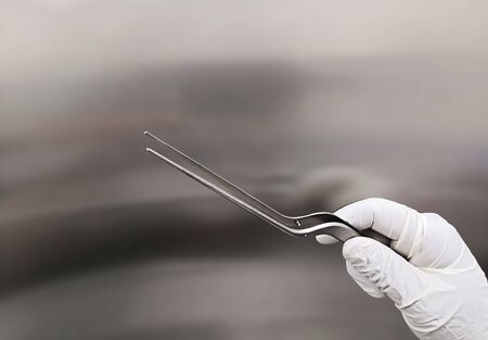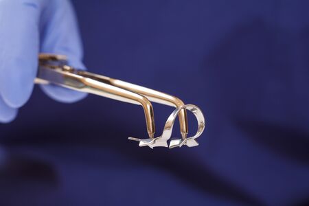 Close-up view of dentist's hand in a latex glove with dental tongs and clasp. Shallow depth of field. Medical tools concept.
