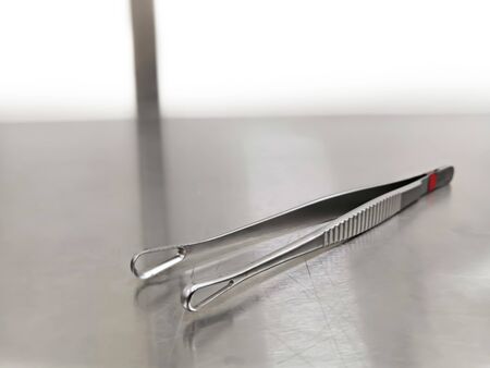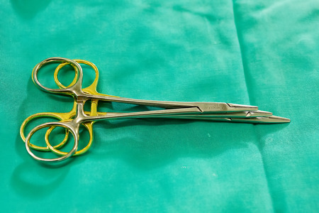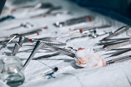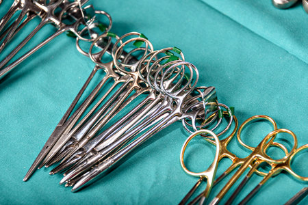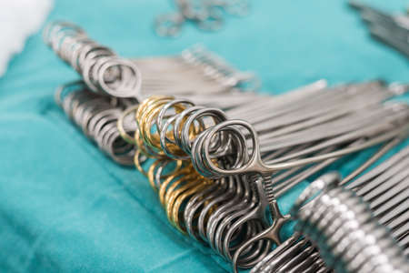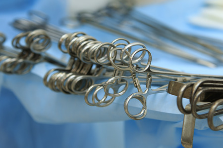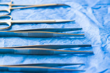 surgical instruments and tools including scalpels, forceps and tweezers arranged on a table for a surgery