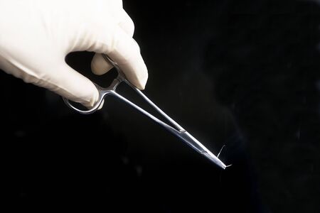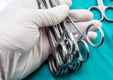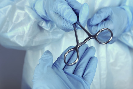 Surgeon working in operating room, hands with gloves holding scissors with torunda, conceptual image, horizontal composition