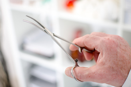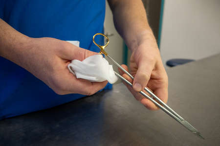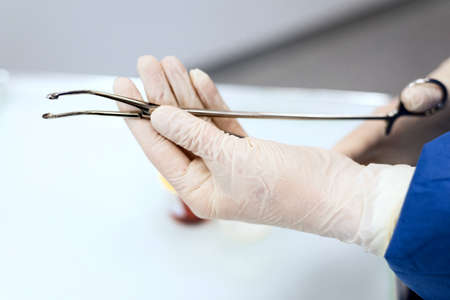 Close up Unrecognizable female surgeon holds needle holder in her hand. Doctor shows how to hold instrument correctly.