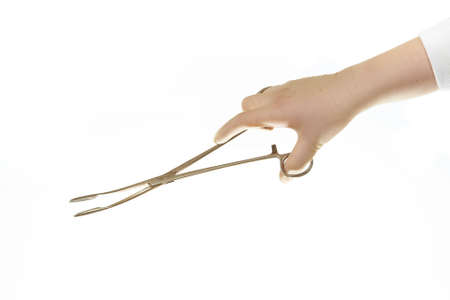 Doctor in a medical glove holds a surgical scissors on a white background, isolate. Close-up, veterinarian