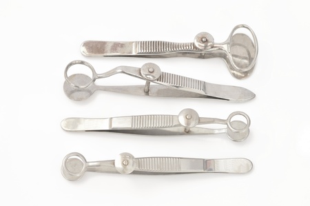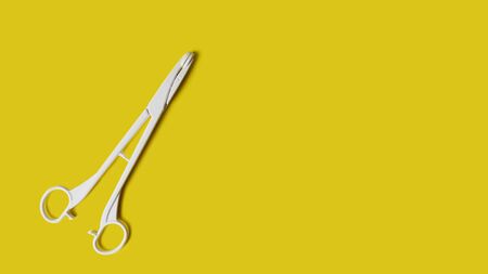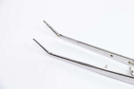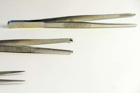 Surgical instrument (clamps, tweezers, scissors) on a white background. Copy space.