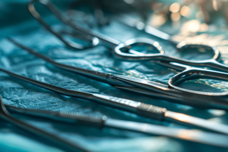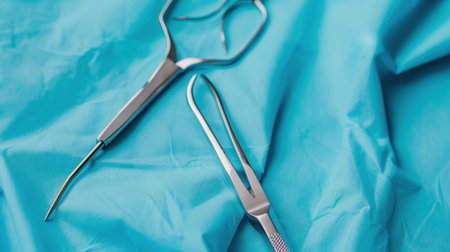 Close-up of surgical instruments resting on blue medical fabric, emphasizing cleanliness and precision used in healthcare settings for surgeries.