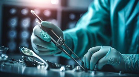 Detail of sterilized surgical instruments with a hand grasping a tool,. Generative AI