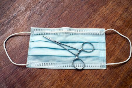 Disposable surgical face mask cover the mouth and nose with eqiupment on the wooden