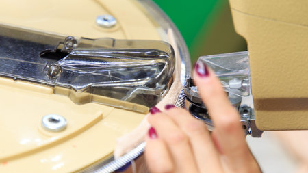 a woman in the sewing shop on the press machine gives the shape of a shirt collar and cuffs
