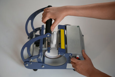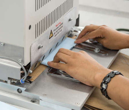 Hands of a woman using a plastic bag sealing machine. plastic film sealing machine. The concept of packaging various items