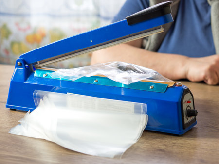 Manual bag sealer for home production, a girl packs finished products with a manual bag sealer