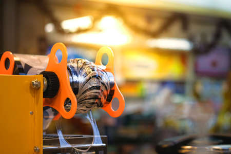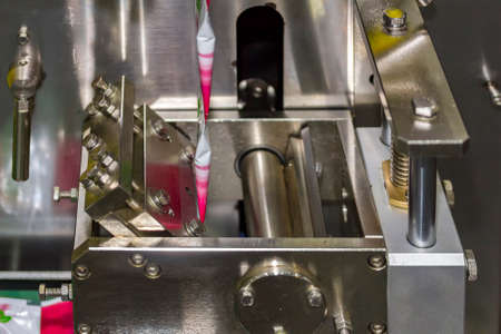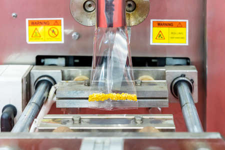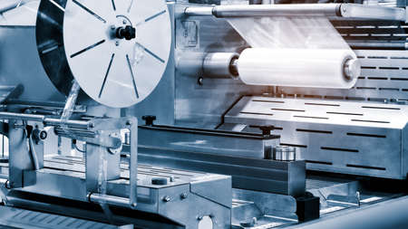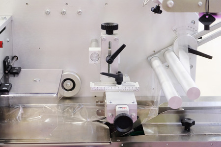close up detail cover and feed plastic film packaging unit of automatic food packing machine for industrial