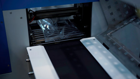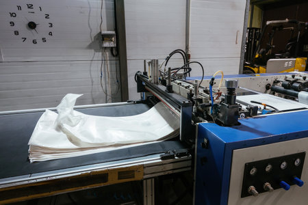 The operation of automatic plastic bag production machine with lighting effect. Close-up of the roller of the plastic bag production machine in the light blue scene. product packaging concept