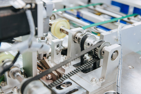 Face mask factory, Surgical mask plant production line, Closeup machine conveyor belt roller in clean hygiene factory