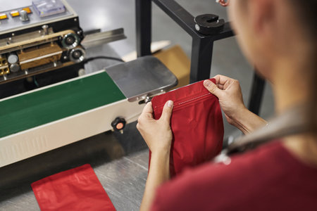 High angle closeup of young woman inspecting packaging at production line in food factory, copy space