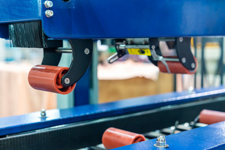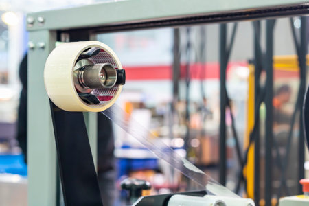 Close up upper urethane rubber roller and brush of automatic box carton sealing machine by masking tape for commercial packing industrial